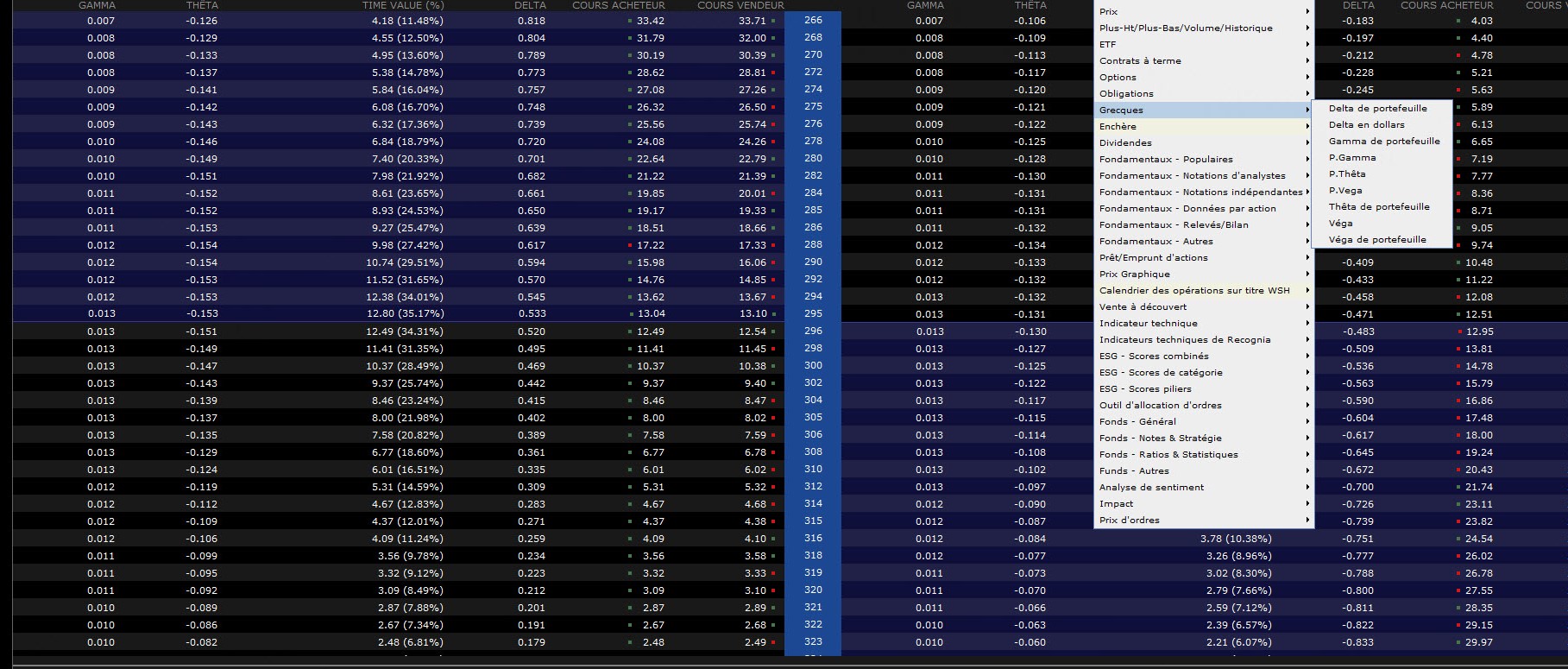 Pour connaître la valeur de la grecque désirée pour l’option désirée, vous pouvez vous rendre dans la chaîne d’options. Dans la plateforme TWS disponible via LYNX, cliquez sur le titre d’une colonne puis sur Insérez une colonne. Dans le menu déroulant qui apparaît, sélectionnez Grecques, puis choisissez la lettre grecque qui vous intéresse (cf. notre image ci-dessus). La chaîne d’options affichera ensuite, pour chaque strike, la valeur correspondante de la grecque choisie.