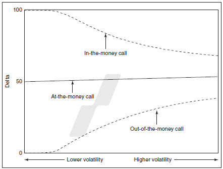 Une augmentation de la volatilité fait augmenter le delta des calls hors de la monnaie. Ce delta se rapproche alors de la valeur 50. De même, le delta des puts se rapproche de la valeur -50. C’est que, lorsque la volatilité augmente, les options hors de la monnaie ont plus de chances de passer dans la monnaie et de voir leur delta dépasser la valeur 50. Inversement, une diminution de la volatilité fait baisser le delta des calls hors de la monnaie, qui s’éloigne alors de la valeur 50. De même, le delta des puts s’éloigne de la valeur -50. C’est que, lorsque la volatilité diminue, les options hors de la monnaie ont plus de chances de rester hors de la monnaie et de voir leur delta se rapprocher de la valeur 0.