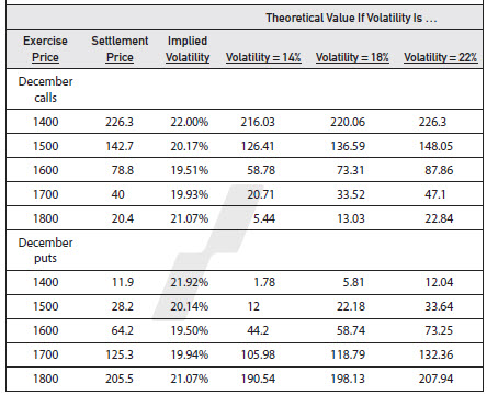 Dans l’illustration ci-dessous, on peut voir l’impact qu’a un changement de la volatilité sur les options hors de la monnaie. Ce tableau indique les valeurs théoriques qu’auraient les calls et les puts étudiés si le prix du sous-jacent s’élevait à 1614,6 $ et si la volatilité passait de 14 % à 18 % et à 22 %.