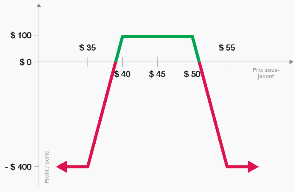 Les strikes sont choisis de manière à respecter la relation X1 < X2 < X3 < X4 et à ce que X1 – X2 = X4 – X3. L’investisseur reçoit une prime nette à l’entrée en position, car les primes des options vendues (X1 et X3) sont supérieures à celles des options achetées (X2 et X4).