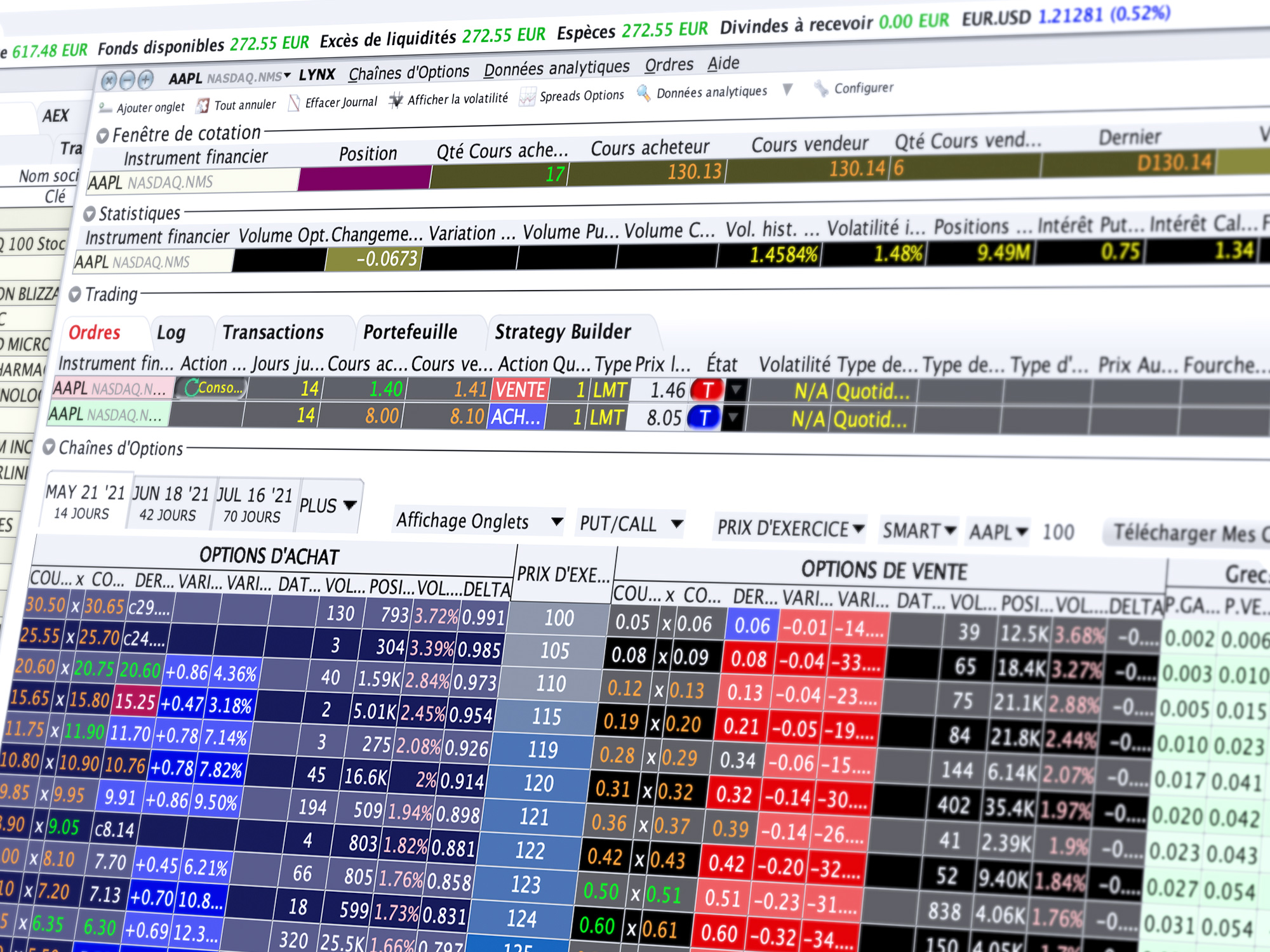 L’OptionTrader propose une interface conviviale et efficace, adaptée aussi bien aux investisseurs débutants qu’aux traders actifs. Il permet une analyse rapide des risques, le passage d’ordres, y compris les ordres combinés et le suivi en temps réel des principaux indicateurs grecs (delta, gamma, theta, vega).